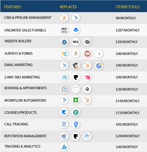 The first ever platform built to manage a Business's CRM, Website, Sales, Ads, Follow-Up, Two-Way Texting, Sales Pipeline, Scheduling, Google Business Listing, Online Reviews, Facebook/Instagram Postings, Facebook Messenger, Instagram DM's, Web Chat and so much more.
